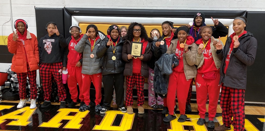 100 Jasmine Johnson (Rantoul); 105 Grace Aeschliman (Metamora); 115 Rilynn Younker (Litchfield/Mt. Olive); 125 Yariah Shaw (Danville); 130 Sydney Cannon (Mt. Zion); 135 Aubrianna Rapier (Bradley Bourbonnais); 140 Rickasia Ivy (Urbana); 145 McKenzie Miller (Gibson City-Melvin-Sibley/Fisher); 170 Jaycee Weitekamp (Mahomet-Seymour); 190 Zanasia Simmons (Peoria Manual); 235 Lillian Disanto (Urbana).