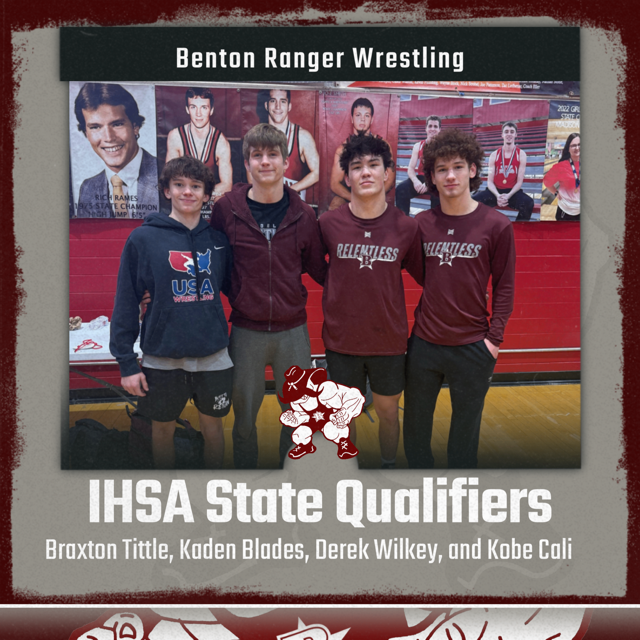 Advancing to state for coach Aaron Robinson’s Benton Rangers were champion Braxton Tittle (106, 45-2) and fourth-place finishers Kaden Blades (144, 45-7), Derek Wilkey (157, 40-8) and Kobe Cali (175, 30-6).