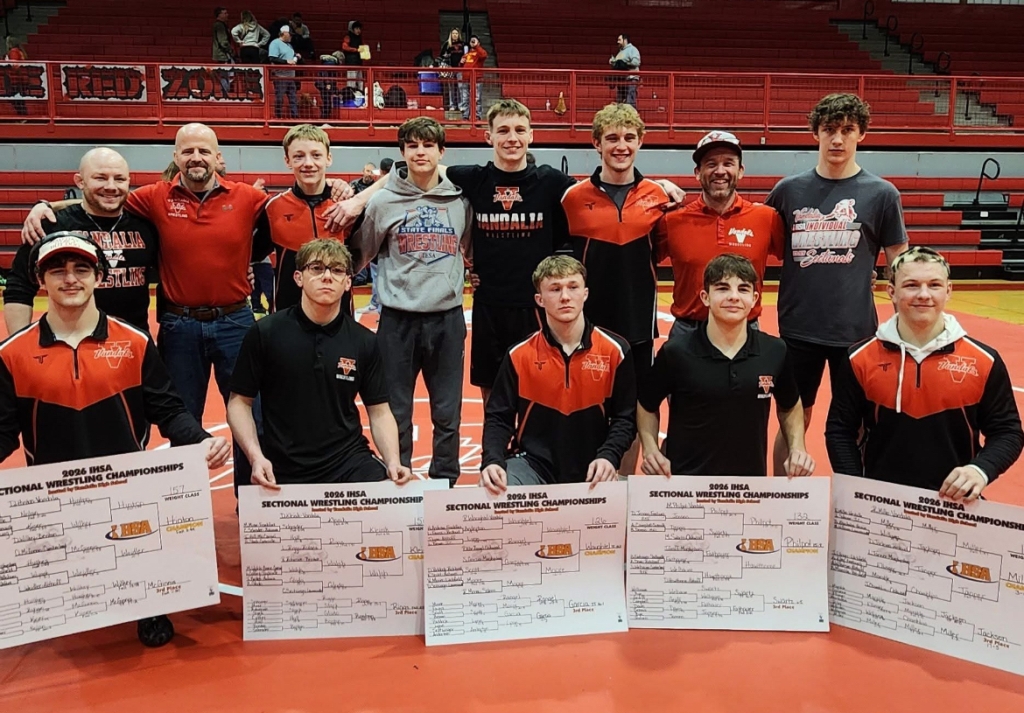 State qualifiers for coach Pat Myers’ Vandalia Vandals included champions Preston Waughtel (126, 25-0), Max Philpot (132, 32-2), Dade Kleinik (150, 30-6), Dillon Hinton (157, 39-3) and Ross Miller (190, 37-7) and runner-up Kaden Daugherty (106, 32-11). Also advancing were third-place finishers Brody Matthews (138, 35-10), Eli Mabry (144, 35-7) and Zayne Zinkgraf (165, 20-6) as well as Riley Hinton (120, 21-9), who claimed fourth place.