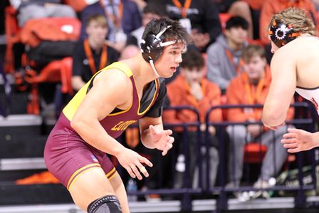 No. 8 Lukas Foster (Joliet Catholic Academy) would bring the crowd to attention when the Hilltoppers junior bounced No. 1 Bobby Ruscitti (Montini Catholic) from the unbeaten ranks with an impressive 10-2 quarterfinal victory.