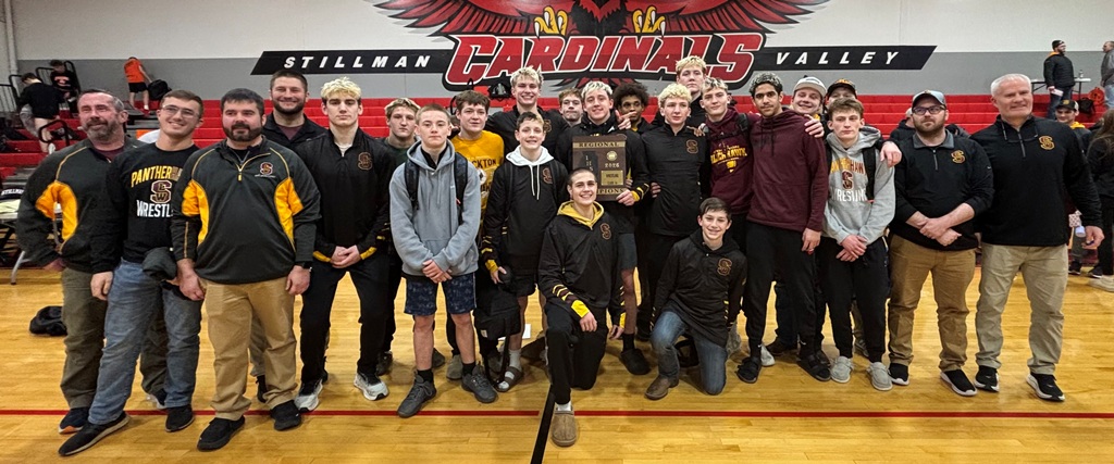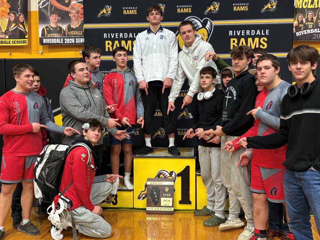 Coach Tom Drosopoulos’ first place Mustangs were led by champions Cael Wright (120), Eli Modglin (126), Patrick Schaefer (138), Caleb Modglin (150) and Noah Stout (190). Mason Grismore (144) and Caleb Carroll (215) took fourth and fell shy of trips to the Byron Sectional.